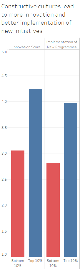 To explore this further we looked at a sample of 200 organisations who have measured their culture as well as a measure of agility or innovation, centered on how well the organisation identifies and responds to changes in its environment and opportunities or threats. It will come as no surprise that the more constructive organisations in this sample scored better on this ‘innovation/agility score’, with the top 10% of organisations outperforming the bottom 10% by 39% while the members of the top organisations also rated their organisation 41% higher on how well new programmes or procedures were implemented.
